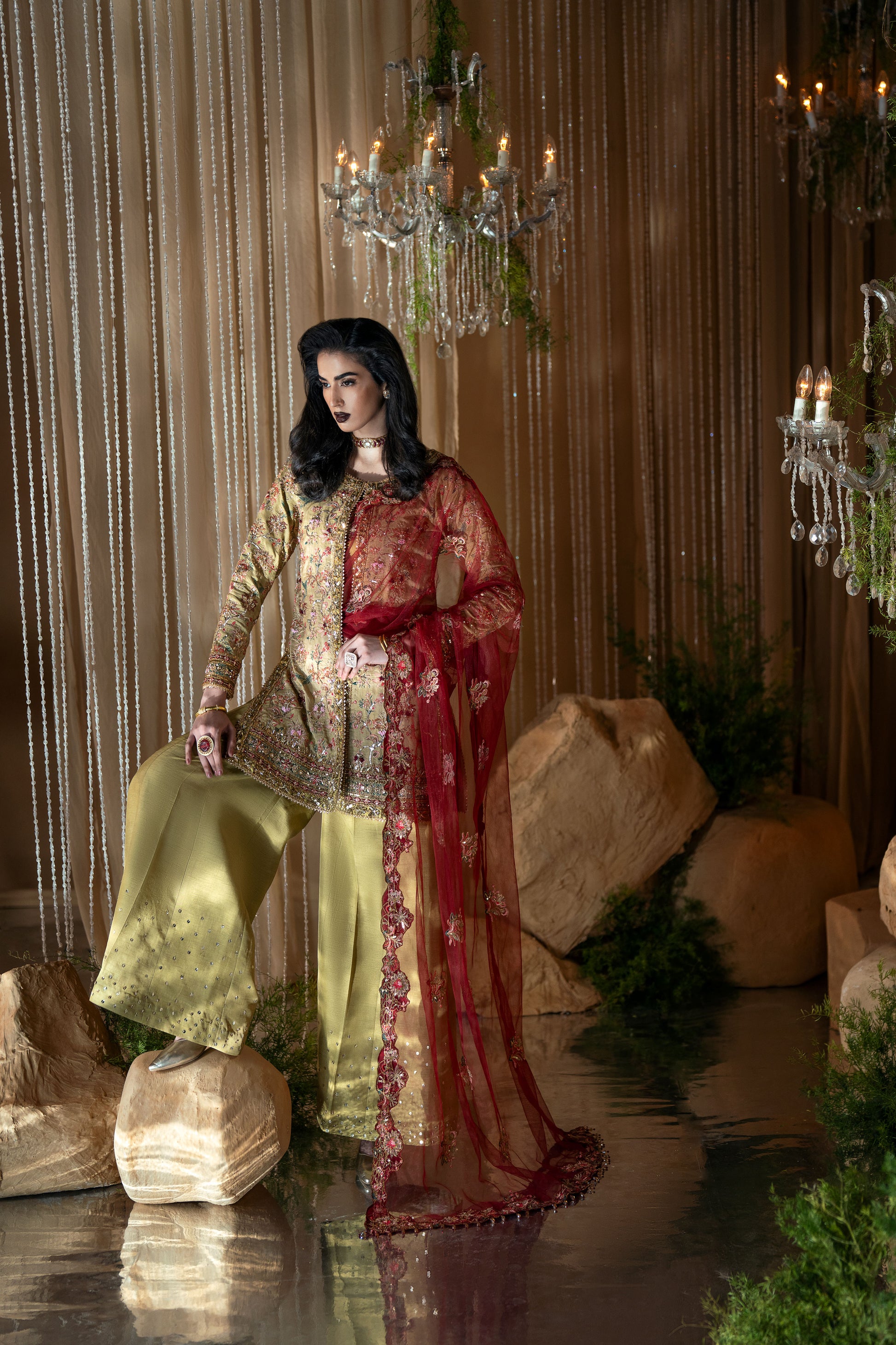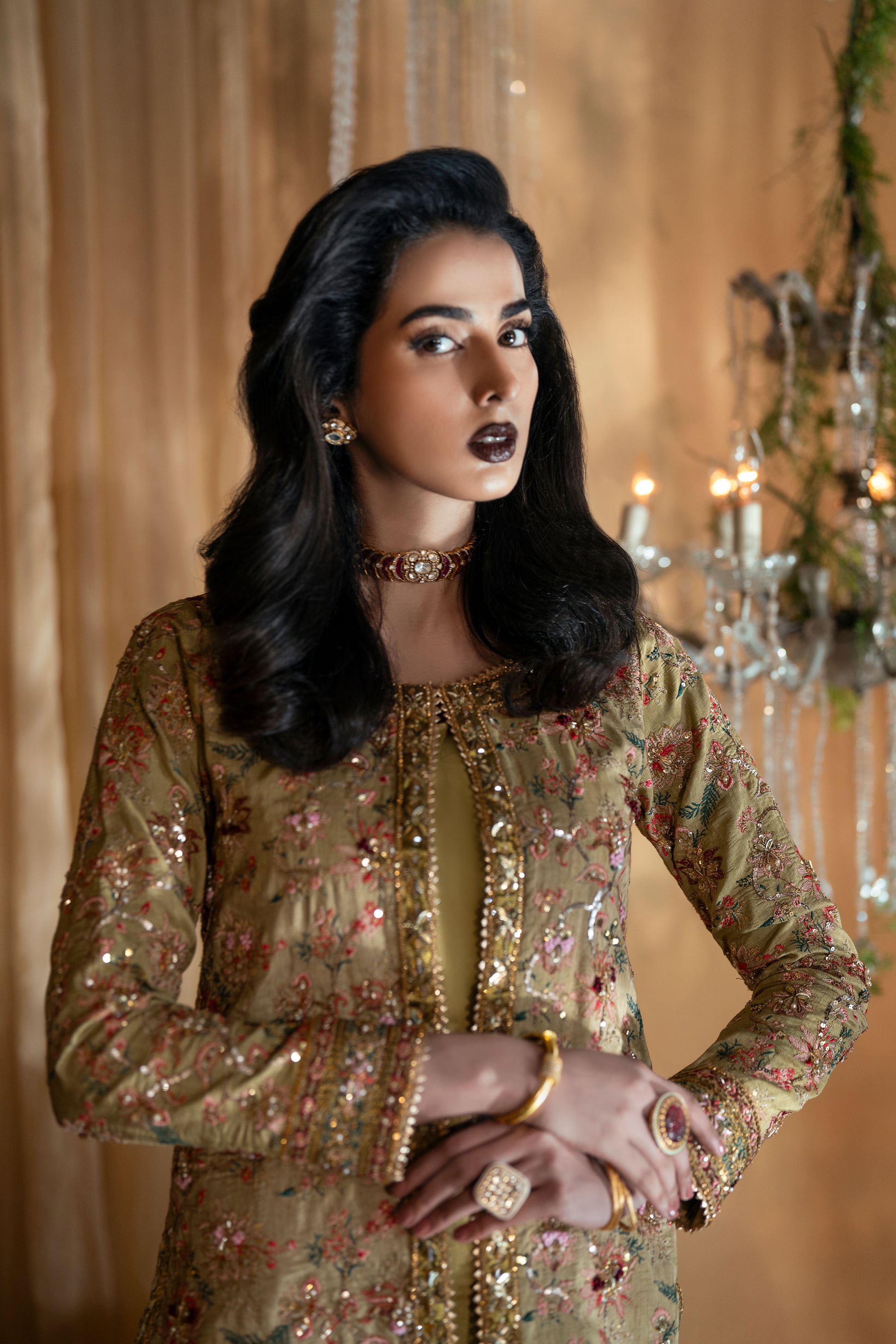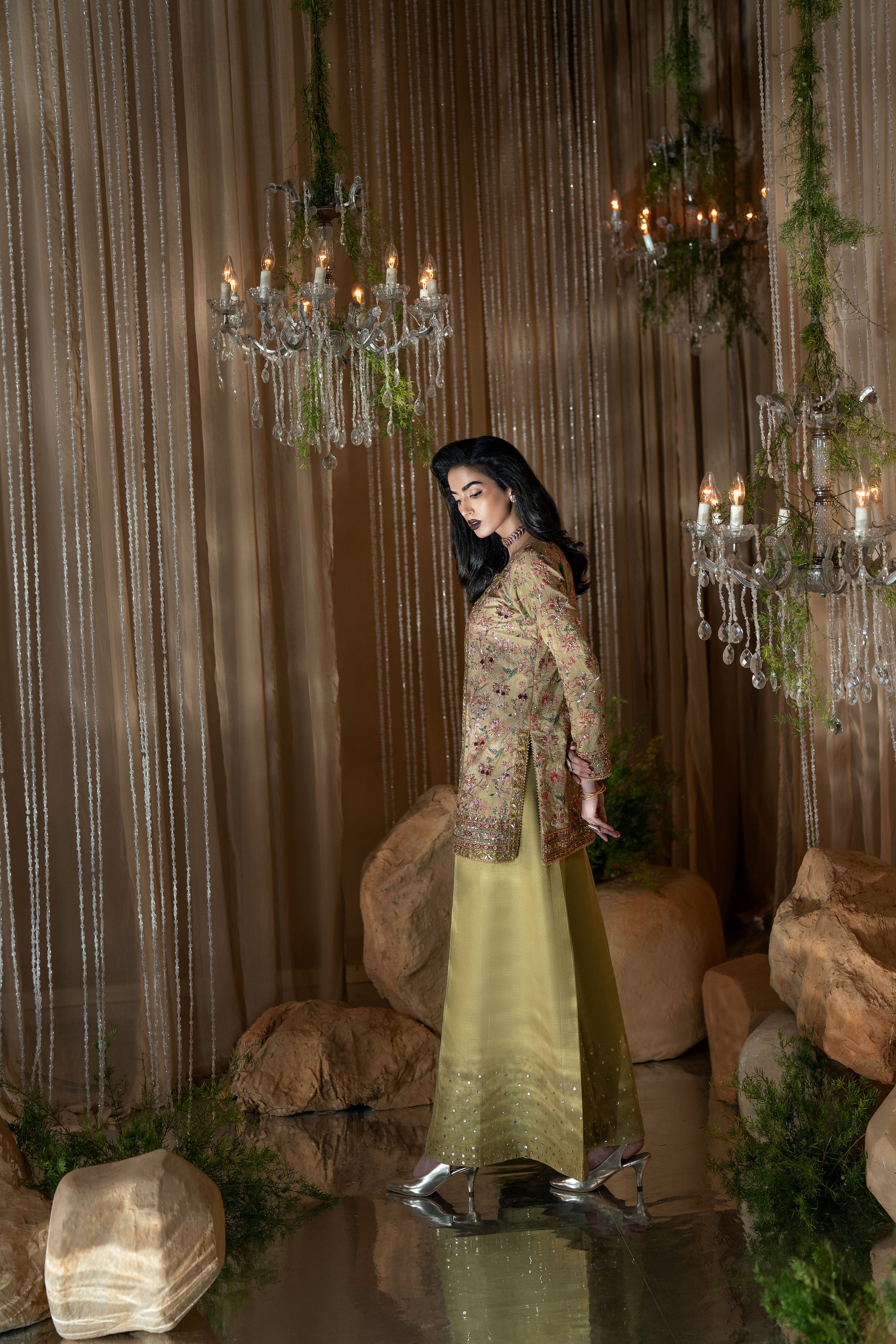 Roseto is an army green raw Korean silk suit paired with a net dupatta. The deep hue and smooth texture of the silk bring a refined charm, while the net dupatta adds a soft, elegant finish. A timeless ensemble with effortless sophistication.