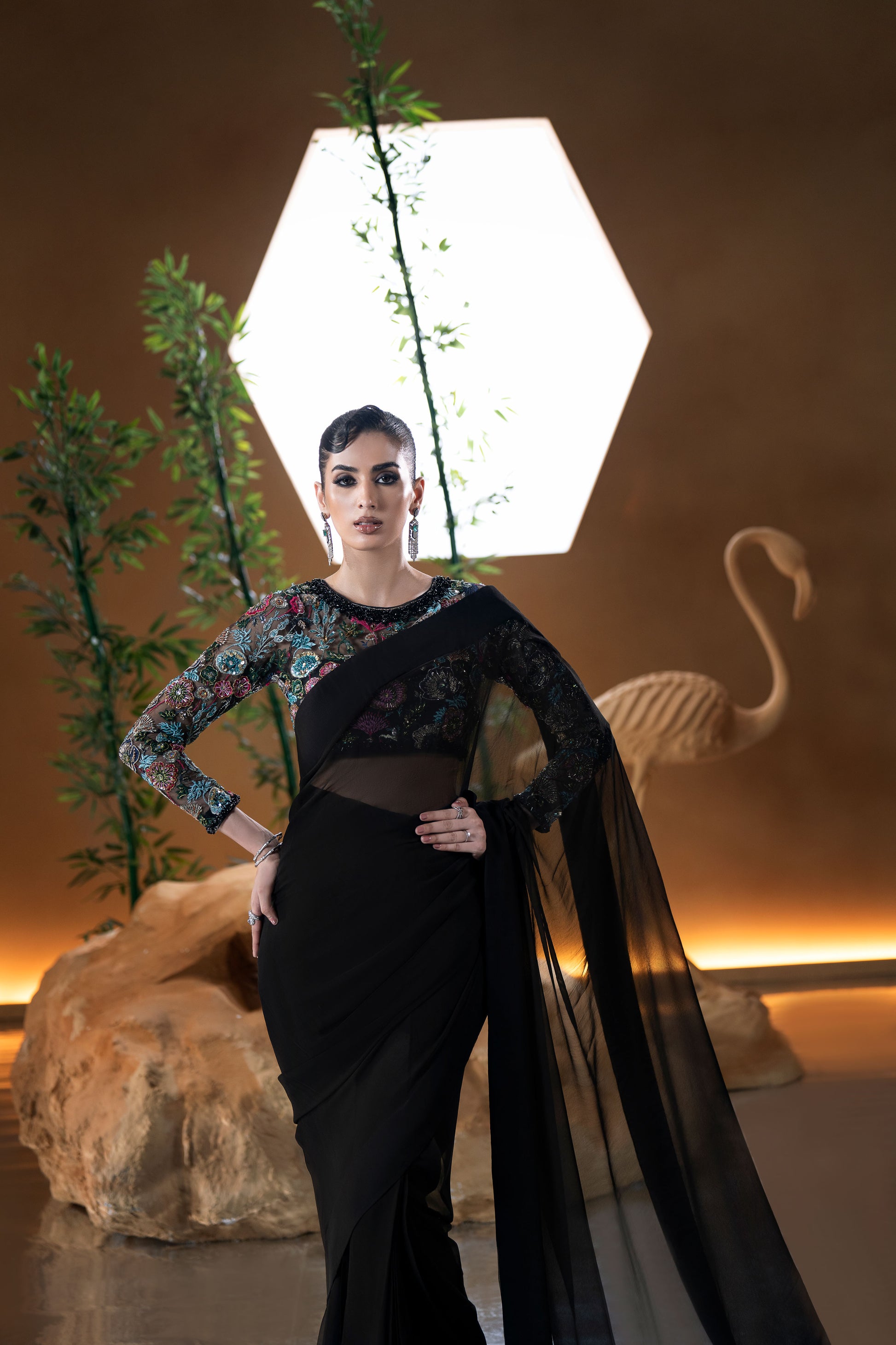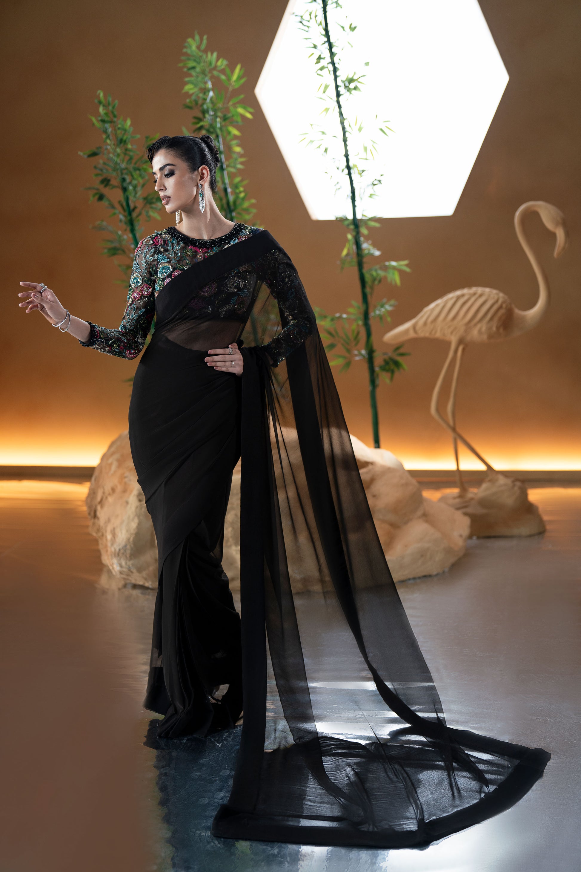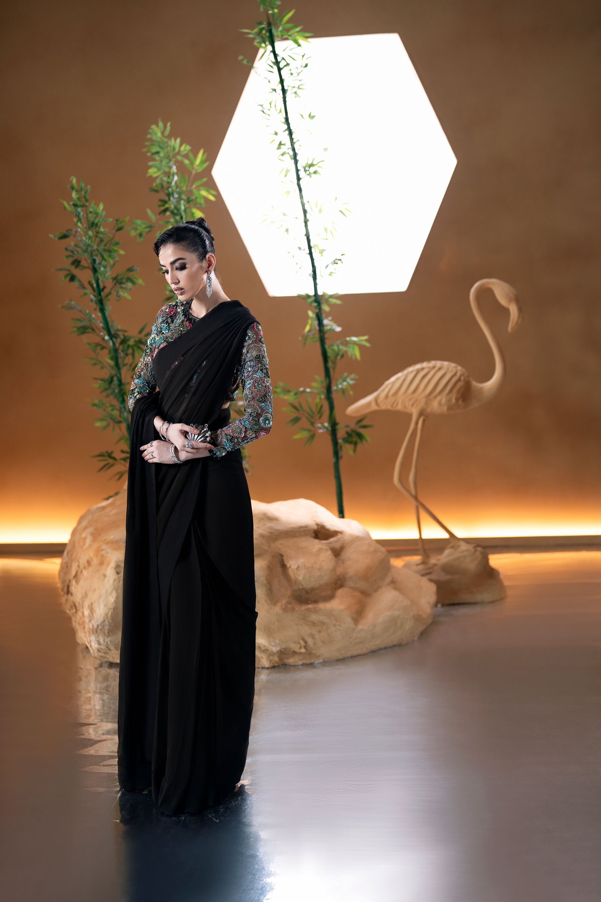 Starlight is a black chiffon saree paired with a net blouse, designed for a graceful and elegant look. The soft chiffon drape falls beautifully, while the delicate blouse adds a touch of charm. A timeless piece perfect for any occasion.